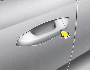 Pressing the button of the front outside door handles with all doors closed and any door unlocked, locks all the doors. The hazard warning lights will blink and the chime will sound once to indicate that all doors are locked. The button will only operate when the smart key is within 0.7 ~ 1 m (28 ~ 40 in.) from the outside door handle. If you want to make sure that a door has locked or not, you should check the door lock button inside the vehicle or pull the outside door handle.