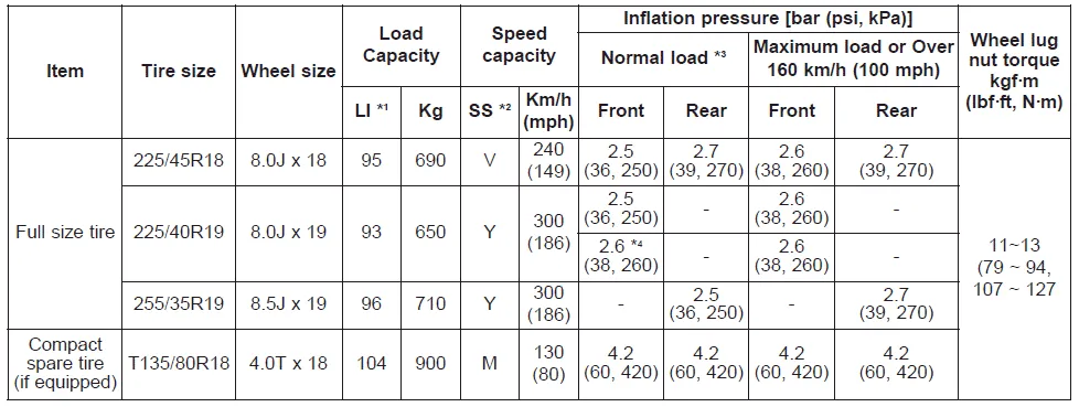 When replacing tires, use the same size originally supplied with the vehicle. Using tires of a different size can damage the related parts or make them work irregularly.