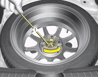 1. Put the jack handle (1) inside of the tire hold-down wing bolt.