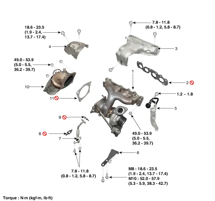 7. Oil drain pipe 8. Turbocharger oil drain pipe gasket A 9. Turbocharger oil drain pipe gasket B 10. Warm-up catalytic converter (WCC) 11.Warm-up catalytic converter (WCC) gasket |