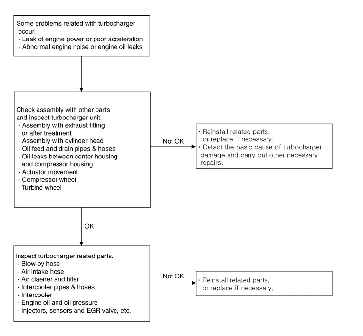 If any problem is not detected in the turbocharger, check the turbocharger-related parts according to the procedure as follows.