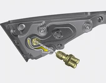 7. Remove the bulb from the socket by pressing it in and rotating it counterclockwise until the tabs on the bulb align with the slots in the socket. Pull the bulb out of the socket.