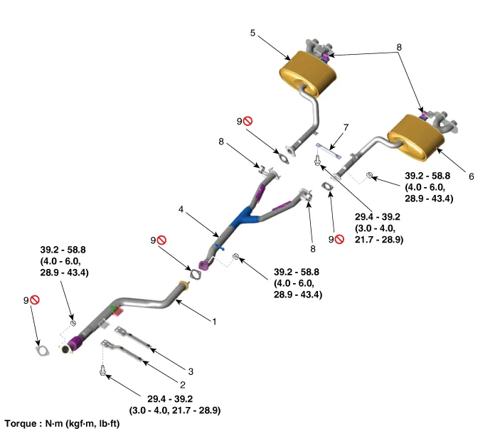 muffler (LH) 7. Rear muffler bracket 8. Rubber hanger 9. Gasket |