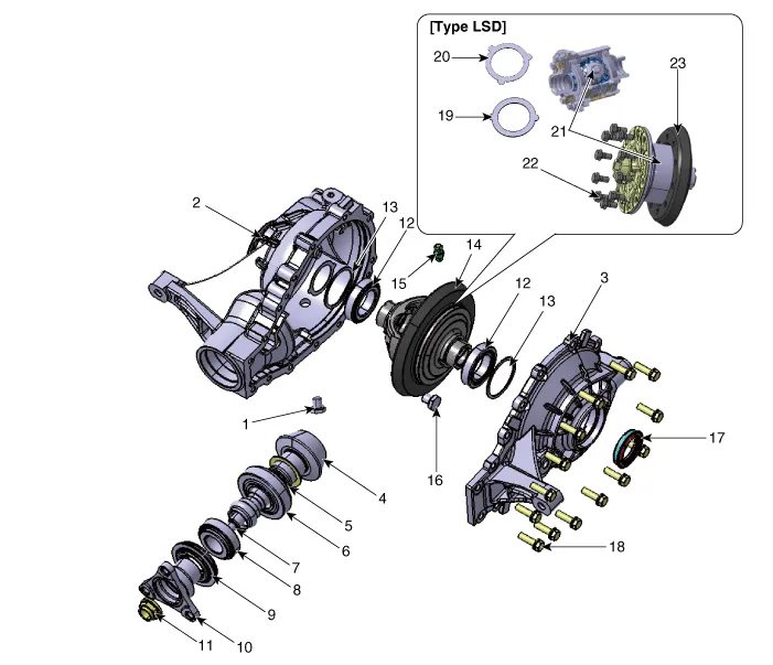 17. Side oil seal 18. Differential case cover bolts 19. Oil guide spacer (RH) 20. Oil guide spacer (LH) 21. LSD 22. Differential case assembly bolts 23. Drive gear |