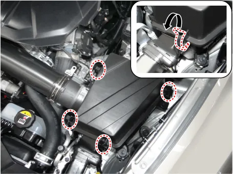 Open the air cleaner element cover (A) by unlocking the clamp. [LH]