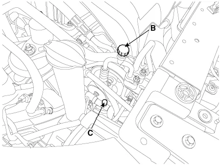 Connect an R-134a refrigerant Recovery/Recycling/Charging system (A) to the high-pressure service port (B) and the low-pressure service port (C) as shown according to the equipment manufacturer's instructions.