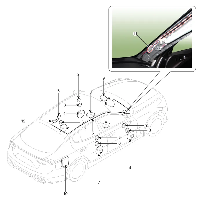 7. Rear door speaker 8. Sub woofer speaker 9. Crash pad center speaker 10. External amplifier 11. Antenna feeder cable 12. Roof antenna (AM/FM) |