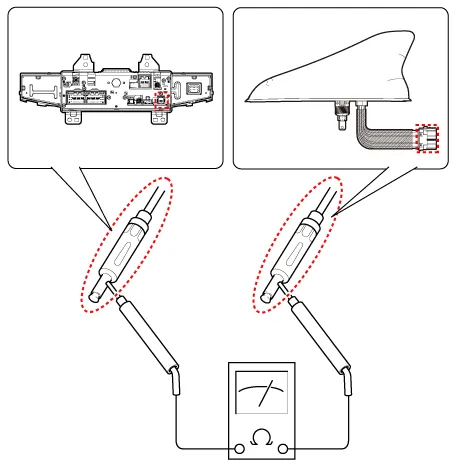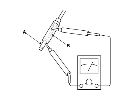Check for continuity between the center pole (A) and outer pole (B) of antenna cable. There should be no continuity.