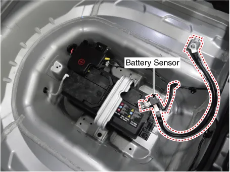 Battery sensor (A) is mounted on battery (-) terminal. It transmits battery voltage,
