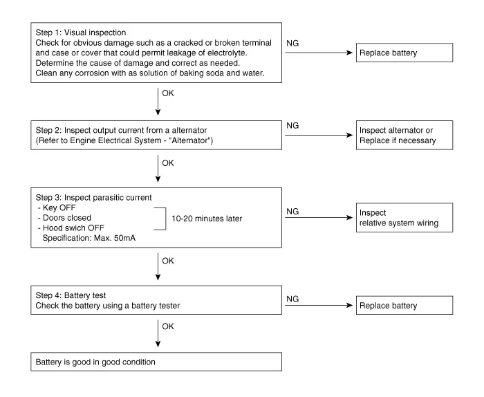 Inspect the battery tray for damage caused by the loss of electrolyte.