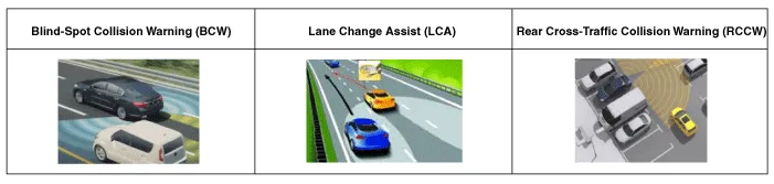 Blind-Spot Collision Warning (BCW) System : Detects other vehicles in the rear blind spot area and warns the driver by indicating on outside rearview mirror. |