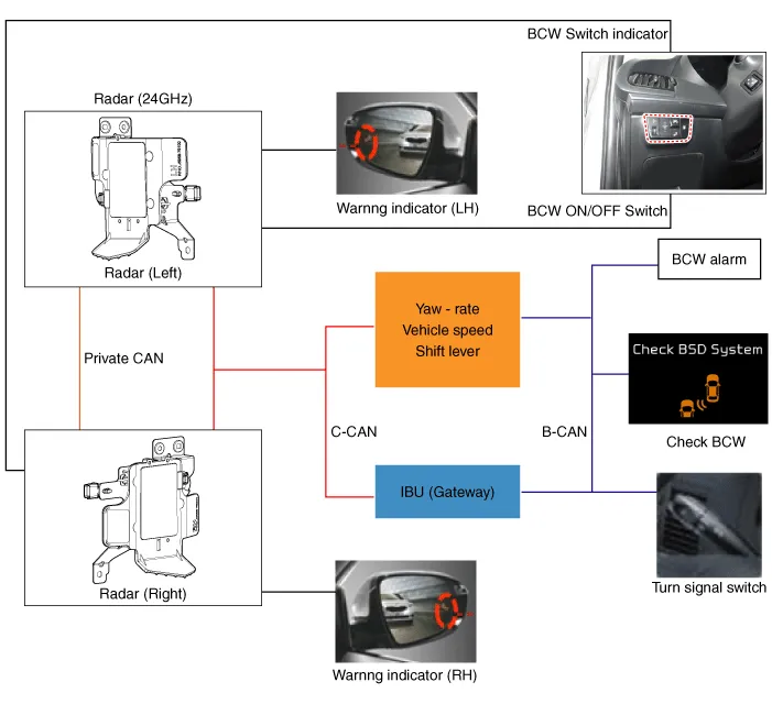 BCW is a system that uses two magnetic wave radar sensors attached on the rear panel to measure the distance from the vehicle in the back and senses and sets off (visual and auditory) alarms for any vehicle coming into the blind spot.