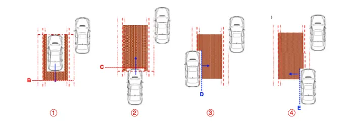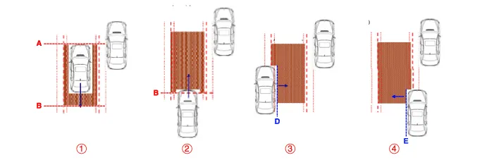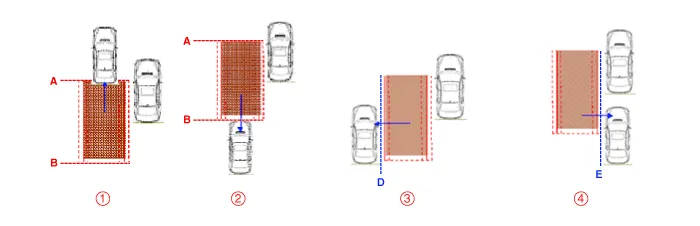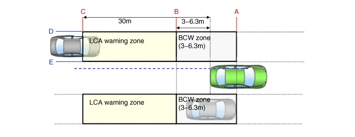 Conditions for BCW warning ON ① The entire body of the target vehicle is located behind the line A. ② Any part of the target vehicle passes the line B. ③ Any part of the target vehicle passes the line D and Hysteresis In. ④ The entire part of the target vehicle passes the line E and Hysteresis In.