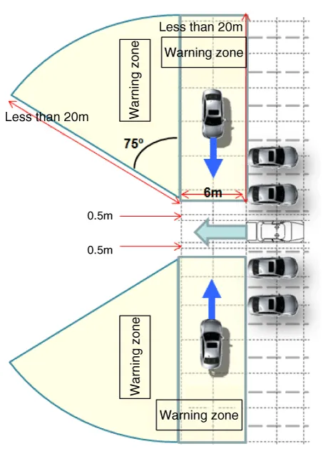 ① This function helps the driver to detect an approaching vehicle from the rear and side that cannot be visually identified when the driver reverses to pull the vehicle out from a parking spot. ② A warning is generated for the target vehicle if it is within 2 seconds based on TTC (Time to Collision). Pedestrians are not considered as approaching targets when warning the driver. (Warning may not be generated.)