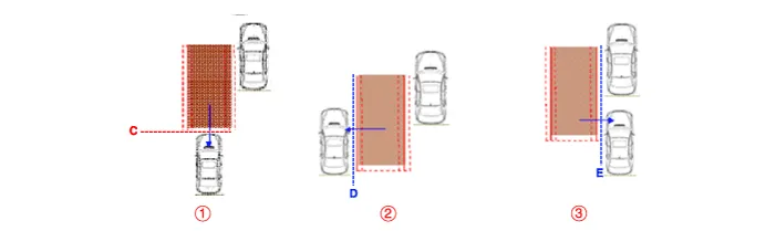 Conditions for LCA warning OFF ① The entire body of the target vehicle passes the line C. ② The entire body of the target vehicle passes the line D and Hysteresis Out. ③ The entire body of the target vehicle passes the line E and Hysteresis Out. ④ TTC (Time to Collision) is more than 3 seconds.