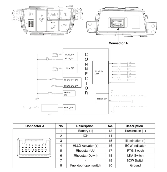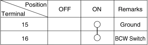 Operate the BCW switch, then check for continuity between terminals and BCW switch connector.