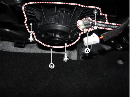 Disconnect the blower motor connector (A) and then remove the blower motor (B) after loosening the screws.