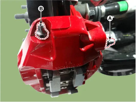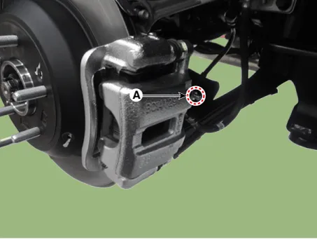 Loosen the rear right-hand side brake bleed screw (A) to allow air to escape from the system. Then tighten the bleed screw securely. [Normal brake] Front