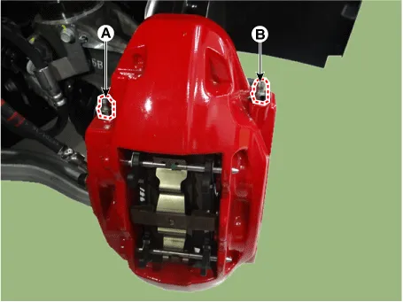 Pump the brake pedal several times, and then loosen the bleeder screw until fluid starts to run out without bubbles. Then close the bleeder screw (A). [Normal brake] Front