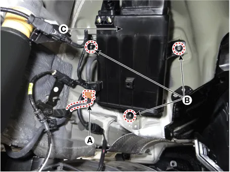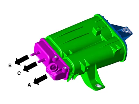 Remove the canister assembly (C) from the vehicle after removing the mounting nuts (B).