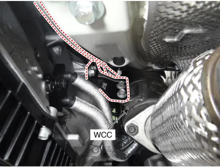 Remove the warm-up catalytic converter (WCC) stay (A).
