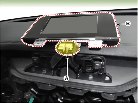 You can check the tire pressure in the information mode on the cluster. - Refer to “User settings mode” in chapter 4. Tire pressure is displayed 1~2 minutes later after driving. If tire pressure is not displayed when the vehicle is stopped, “Drive to display” message displays. After driving, check the tire pressure. You can change the tire pressure unit in the user settings mode on the cluster.Repair procedures Replacement 1. Disconnect the negative (-) battery terminal. 2. Remove the heater unit. (Refer to Heater - "Heater Unit") 3. Remove the heater unit lower case (A) after loosening the screws. 4.