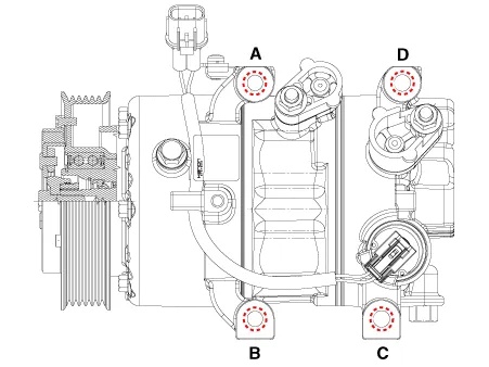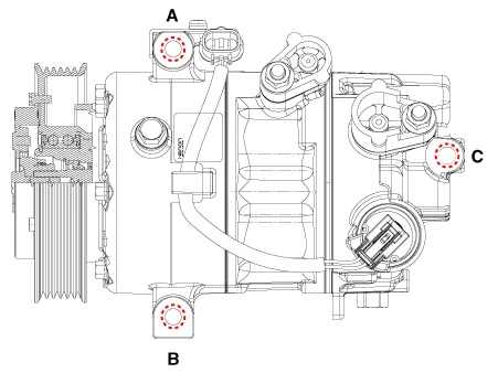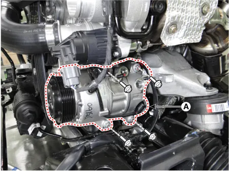 Remove the compressor assembly (A) after loosening the bolts.