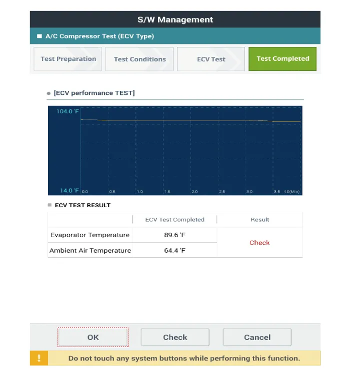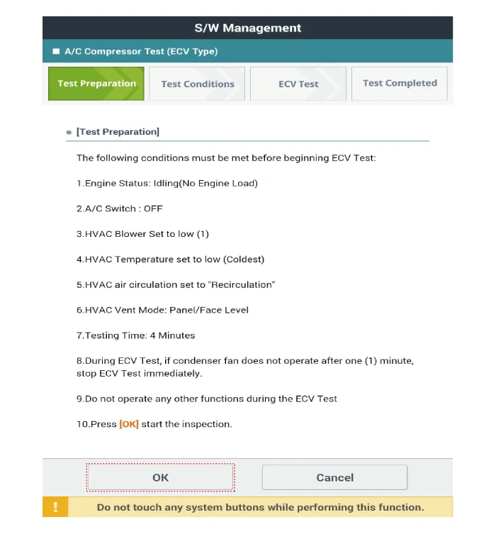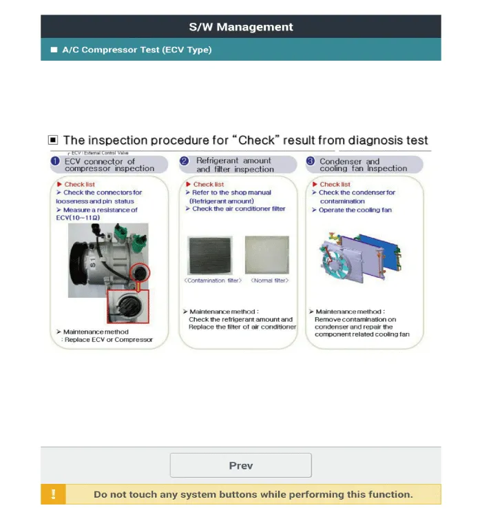 Check if other DTC codes are found before inspect ECV compressor. If so, solve that problems first. If not, press 'OK' button to continue.