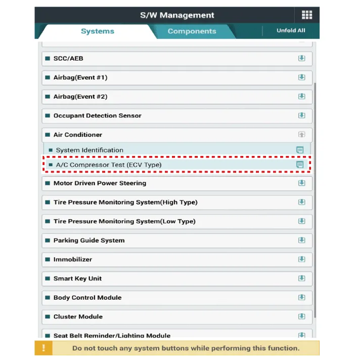Connect KDS to the vehicle and select 'Aircon Compressor Test(ECV type)' [ECV1]