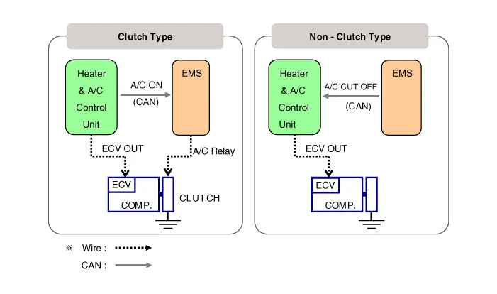 The externally controlled variable swash plate compressor changes the swash plate angle by the ECV (Electric Control Valve) in accordance with an electrical signal from the heater & A/C control unit.