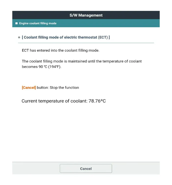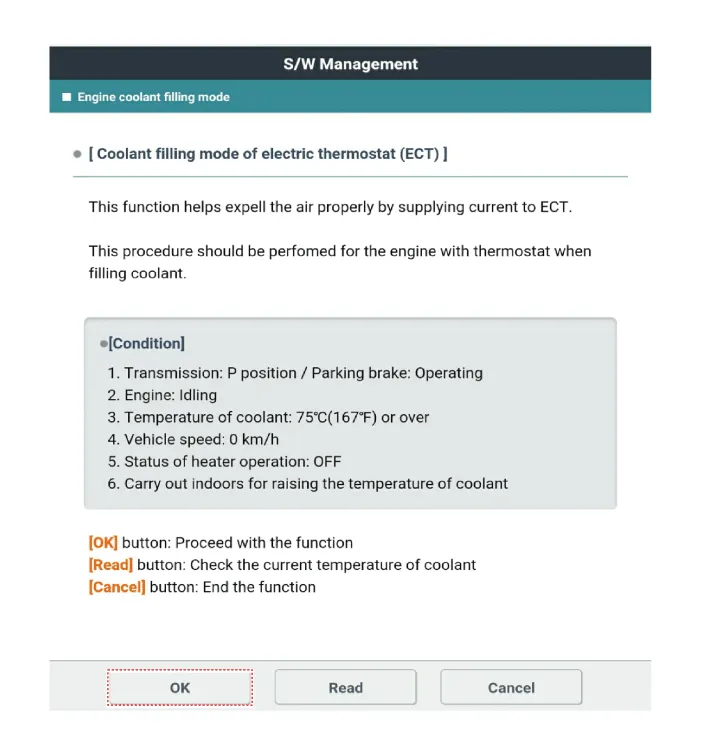 Check the engine coolant filling mode entry conditions and then press the "Read" to check the current coolant temperature.