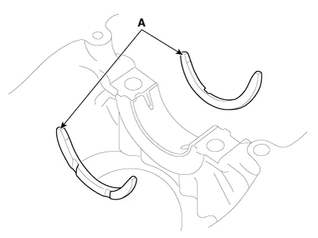 Install the thrust bearings. Install the 2 thrust bearings (A) under the No.3 journal position of the cylinder block with the oil grooves facing outward.