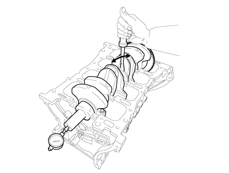 Check crankshaft end play. Using a dial indicator, measure the thrust clearance while prying the crankshaft back and forth with a screwdriver.