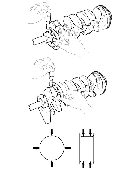 Inspect main journals and crank pins. Using a micrometer, measure the diameter of each main journal and crank pin.