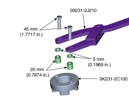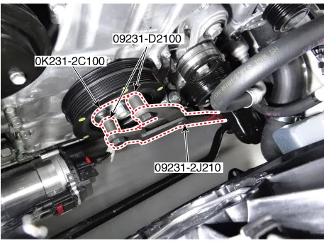 Install the SSTs (09231-2J210, 09231-D2100) on the SST (0K231-2C100) and then unfasten the crankshaft damper pulley mounting bolt.