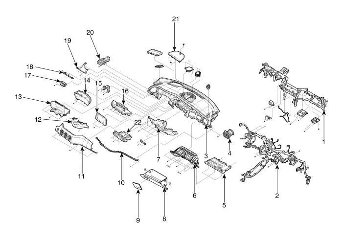 | 1. Cowl cross member bar 2. Main wiring 3. Main crash pad 4. Side air vent duct [RH] 5. Crash pad under cover [RH] 6. Crash pad lower panel [RH] 7. Crash pad center lower cover 8. Glove box housing 9. Fuse A/S cover 10. Crash pad garnish [RH] 11. Crash pad passenger side panel |