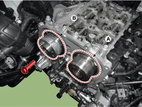 Disconnect the intake E-CVVT assembly (A) and exhaust CVVT assembly (B).