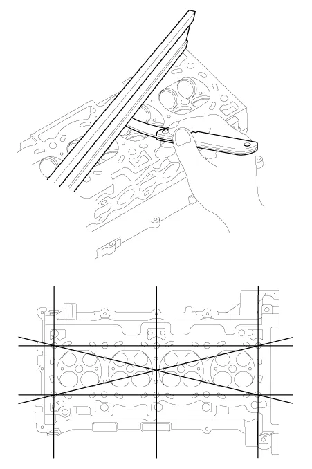 Inspect for flatness. Using a precision straight edge and feeler gauge, measure the surface the contacting the cylinder block and the manifolds for warpage. If the flatness is greater than maximum, replace the cylinder head.