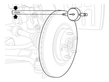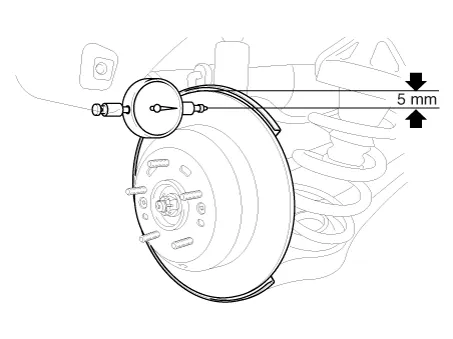Place a dial gauge about 5mm (0.2 in.) from the outer circumference of the brake disc, and measure the runout of the disc.