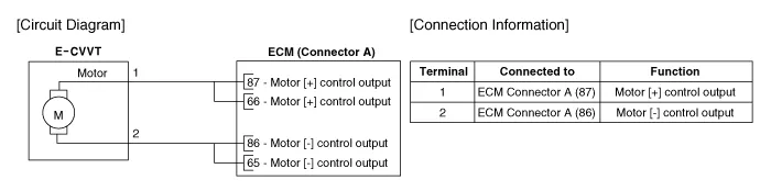 E-CVVT (Electric Continuous Variable Valve Timing) system, located on the intake camshaft of the engine, uses motor rotation to control the rotation angle of camshaft relative to the rotation of crankshaft regardless of engine pressure. E-CVVT controls the DC motor current (duty signal) to more closely control the system compared to the previous pressure type, to increase reaction speed of cam, to improve startability, and to reduce the emission of exhaust gas. Also, operation range of intake valve (valve opening angle) is expanded. So, the output and fuel efficiency are improved.