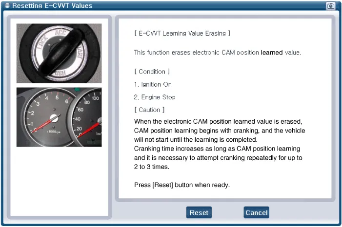 After replacing or remounting the E-CVVT assembly, be sure to reset the learned value from the additional feature menu on the KDS diagnostic device. When the learned value for electronic cam position is erased, start learning the cam position while cranking. The engine can start once this is completed. Cranking should be repeated for up to 2-3 times to complete learning.