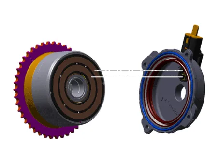 Appearance of E-CVVT is similar to that of hydraulic CVVT. Connector that drives DC motor and protection cover that protects the motor are mounted on the upper part. DC motor that drives the CVVT is mounted inside and covering part is sealed in order to protect oil from flowing inside.