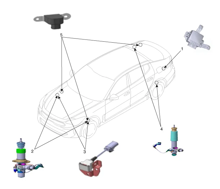 | 1. ECS ECU 2. Front ECS Damper 3. Wheel speed sensor |