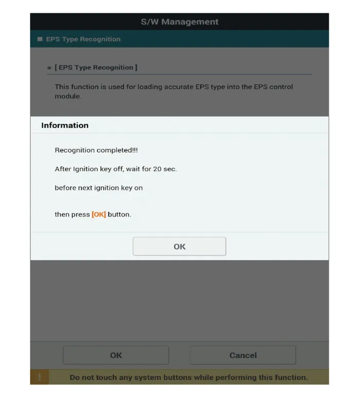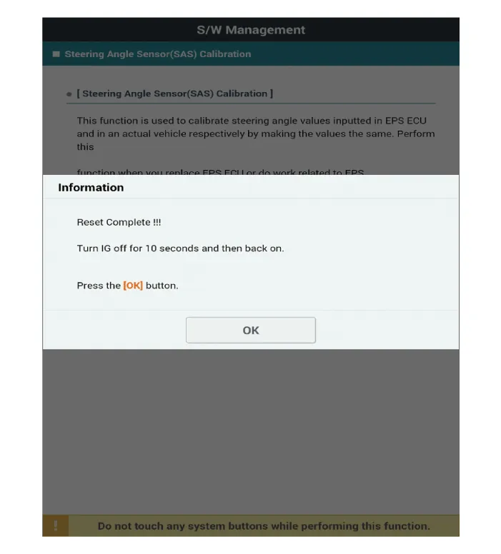 After completing the ASP calibration or EPS type recognition, switch off the ignition and wait for several seconds. Then, start the engine to confirm normal operation of the vehicle. |