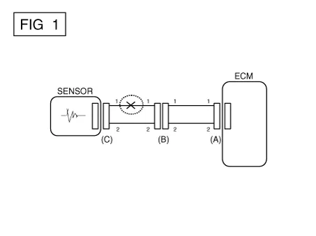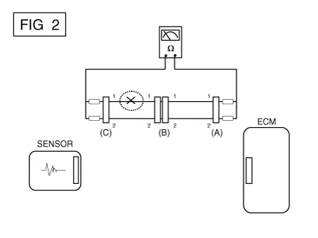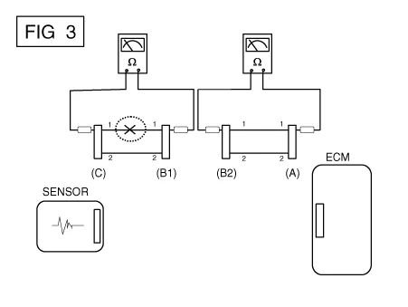 In this case, the measured resistance between connectors (C) and (B1) is higher than 1 MΩ and the open circuit is between terminal 1 of connector (C) and terminal 1 of connector (B1).
