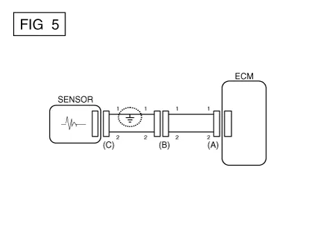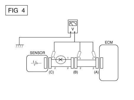 With each connector still connected, measure the voltage between the chassis ground and terminal 1 of each of connectors (A), (B) and (C) as shown in [FIG. 4].