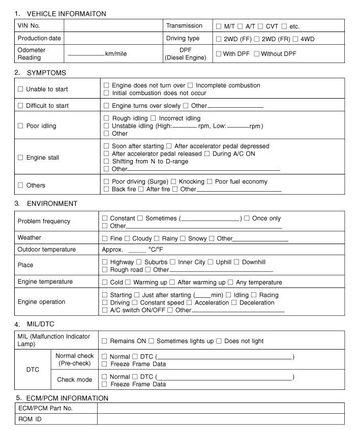 Sometimes the most difficult case in troubleshooting is when a problem symptom occurs but does not reoccur during test. An example would be if a problem appears only when the vehicle is cold but has not appeared when warm. In this case, the technician should thoroughly make out a "Customer Problem Analysis Sheet" and recreate (simulate) the environment and condition in which the vehicle was having the issue.