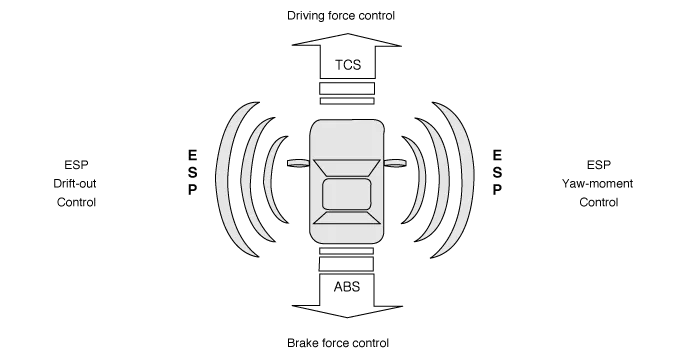 The stability control feature works under all driving and operating conditions. Under certain driving conditions, the ABS/TCS function can be activated simultaneously with the ESP function in response to a command by the driver.