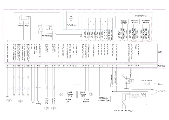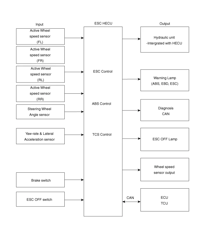 TCS function prevents the wheel slip of drive direction by adding the brake pressure and engine torque reduction via CAN communication. TCS function uses the wheel speed sensor signal to determine the wheel slip as far as ABS function.