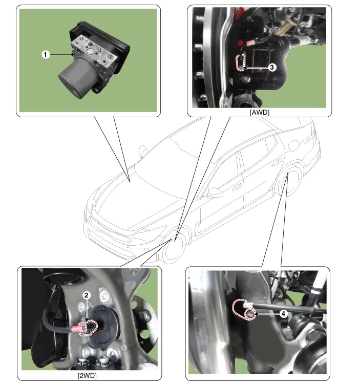 | 1. HECU module 2. Front wheel speed sensor (2WD) |